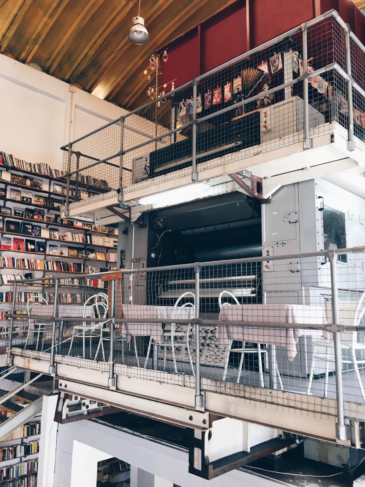 Ao longo de toda a livraria têm sempre a colossal rotativa no centro que, curiosamente, combina muito harmoniosamente com o restante espaço, e por onde podem subir para ter novas visões da Ler Devagar ou para lanchar. Existem dois cafés em todo o espaço - um deles com o famoso Bolo da Marta - e inúmeras mesas onde podem fazer o tempo parar enquanto fazem o estômago feliz e deixam-se envolver por um livro. É um lugar que, se estivesse perto da minha casa, seria eleito para eu estudar ou simplesmente estar.