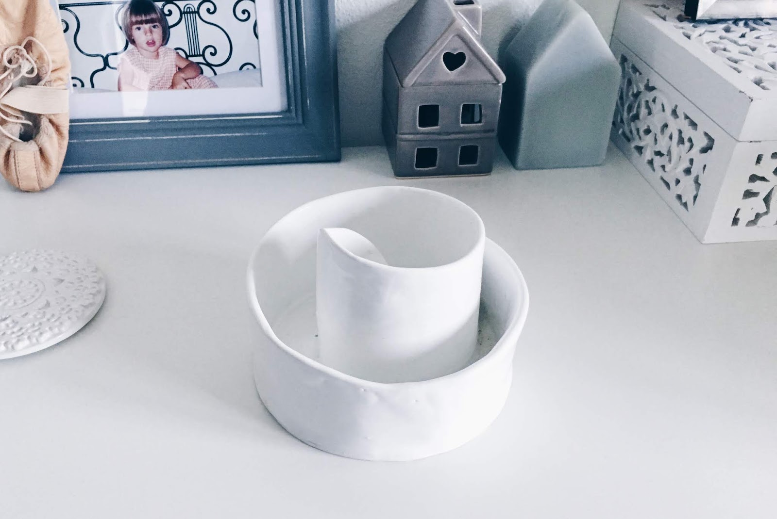 Claro está, não foi esse o intuito com que escolhi a minha peça e esta versatilidade fascina-me tanto quanto a Fátima, que logo me perguntou se a iria utilizar para o propósito original com que pensou e planeou a peça — embora já desconfiasse que não e que isso a deixasse muito intrigada com a originalidade dos seus clientes. Eu escolhi uma peça em espiral — que também existia num tom azul lindíssimo mas que, para a minha decoração, fazia mais sentido a branca — e o acabamento imperfeito a combinar com o design arrojado encantaram-me assim que lhe peguei. Nasceu para ser um vaso de plantas mas, em minha casa, tem sido um incrível porta-joias — onde uso a zona central e mais larga para guardar acessórios maiores e a divisória mais fininha para guardar os anéis e outros detalhes pequeninos que tenho perdidos pela casa e que não quero que fiquem dispersos. Cumpre na perfeição a sua missão, além de me fazer sempre recordar com carinho o nosso passeio despreocupado por Estremoz.
